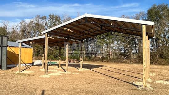 Buildings And More offers two levels of barn structures: Stage 1, which comes standard with 6x6 pressure-treated posts and 29-gauge metal roofing, engineered to withstand 105 MPH winds; and Stage 2, which comes standard with 8x8 pressure-treated posts and 26-gauge metal roofing, engineered to withstand 145 MPH winds.
